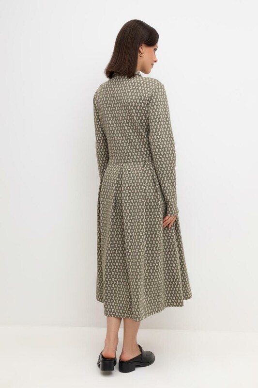 Платье с воротником из плотного набивного трикотажа интерлок. Модель с длинными рукавами и юбкой в складку. Все трикотажные полотна производятся в соответствии с нормами Швейцарского сертификата ЭкоТекс. Сделано в России