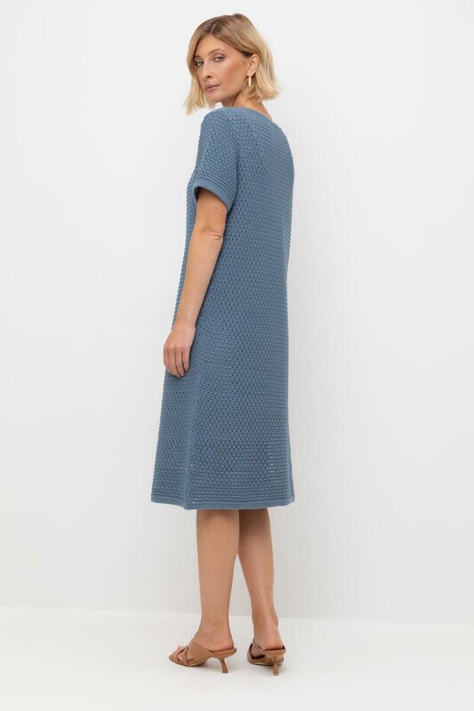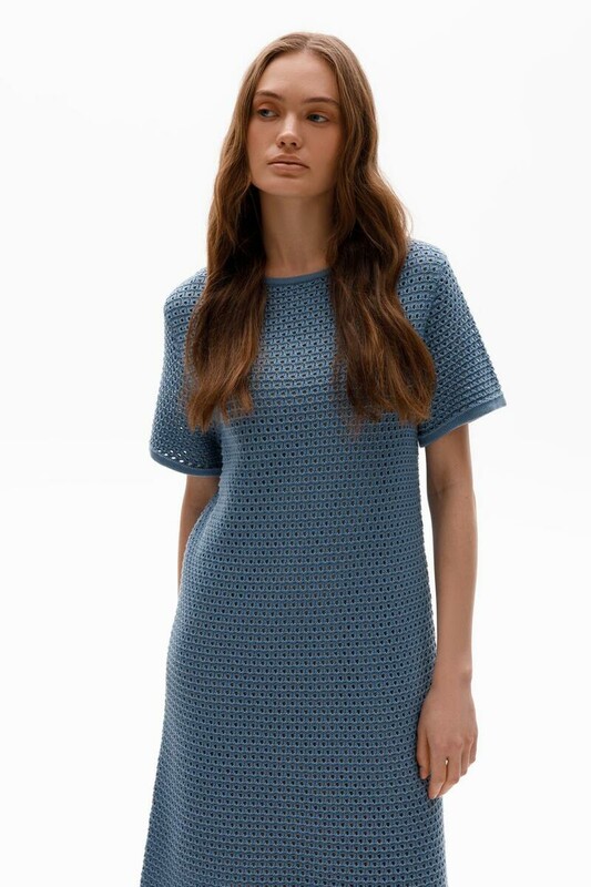 Платье ажурной вязки в нежно-голубом оттенке из итальянского хлопка. Дополняет изделие внутренний невесомый подклад из премиального бифлекса телесного цвета. Хлопок в составе сохраняет форму и дарит ощущение комфорта во время носки.