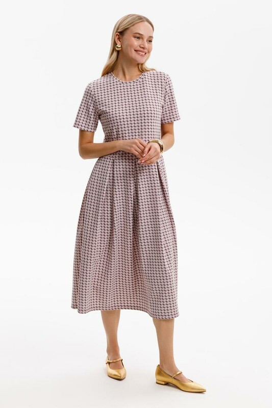 Платье отрезное по талии из премиального трикотажного полотна DOUBLE FACE. Встречные складки на юбке придают изделию женственный и романтичный образ. Яркий геометрический рисунок добавляет летнего настроения. Натуральный состав трикотажа приятен к телу, что делает его комфортным при носке в любое время года