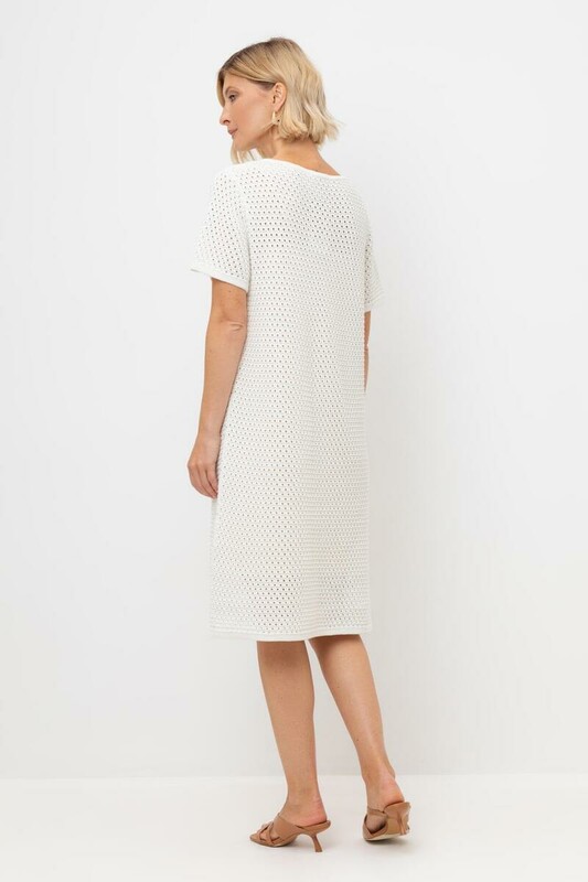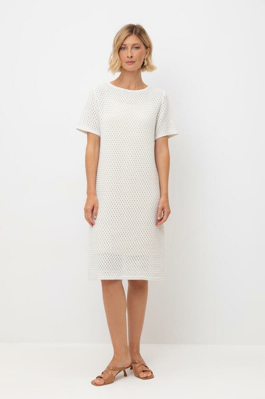 Платье ажурной вязки в молочном оттенке из итальянского хлопка. Дополняет изделие внутренний невесомый подклад из премиального бифлекса телесного цвета. Хлопок в составе сохраняет форму и дарит ощущение комфорта во время носки.