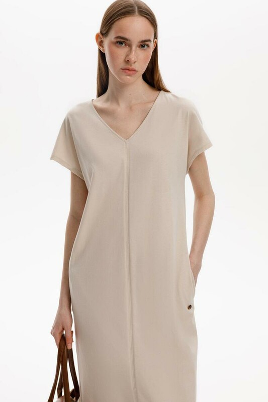 Лаконичное трикотажное платье из 100% мягкого хлопка. Наличие боковых карманов придают изделию функциональность.