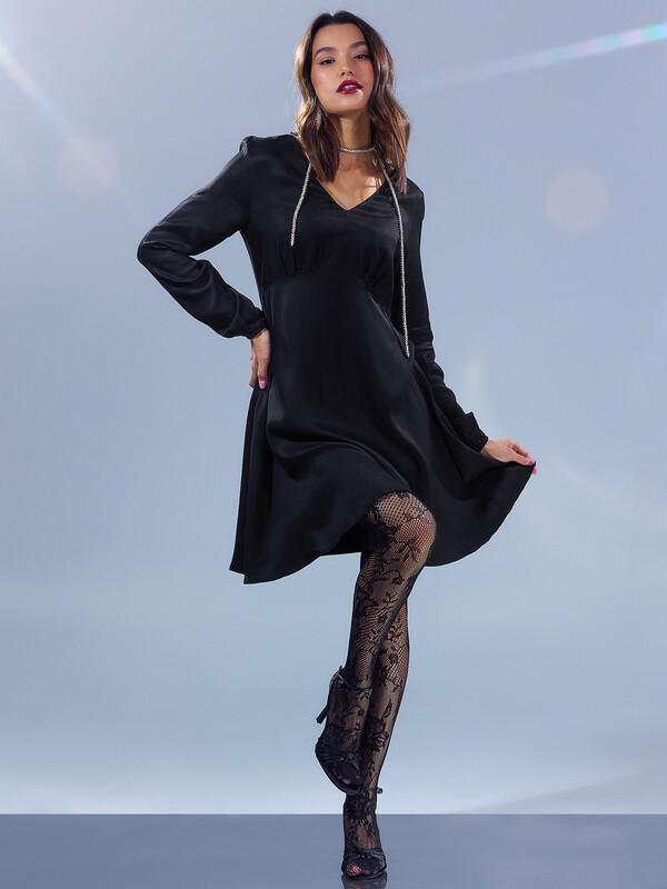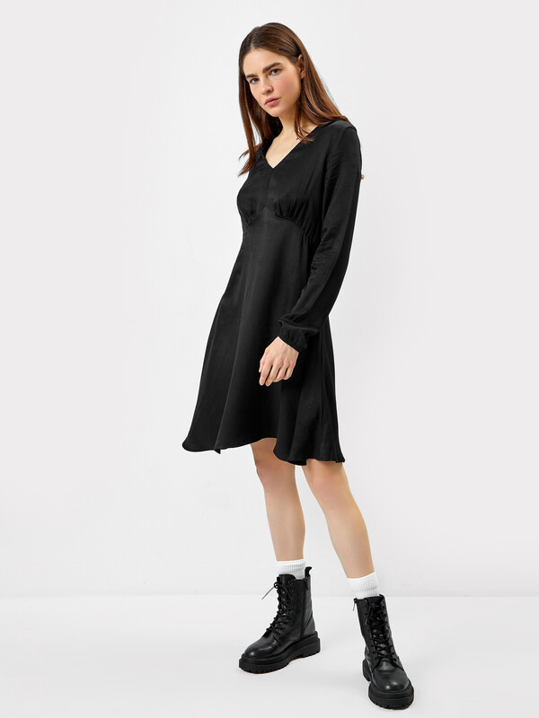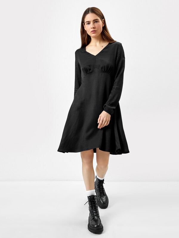 Текстильное женское платье полуприлегающего, постепенно расширяющегося силуэта. Длина – чуть выше колена. Модель отрезная по линии талии, под грудью проходит фигурная линия талии. Вырез горловины V-образный. Рукава длинные, с небольшими сборками, немного расширяются к низу. Низ рукава с эластичной тесьмой образует небольшую сборку. Легкое парящее платье для различных образов!