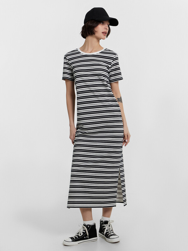 Платье свободного силуэта из футера. Платье имеет длину "миди" и удлиненную линию плеча. Изюминка модели – изящные боковые разрезы, которые очень популярны в текущем сезоне. Рукава короткие, вырез горловины круглый. Стильно!