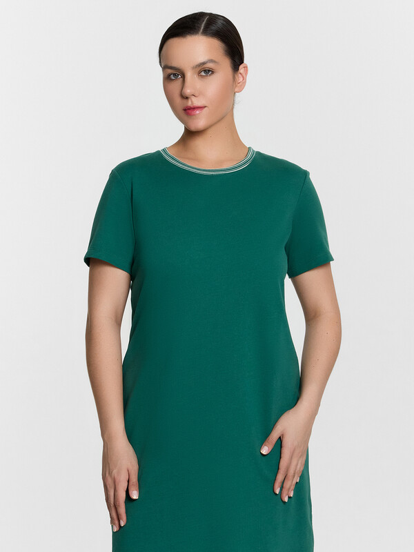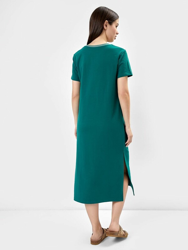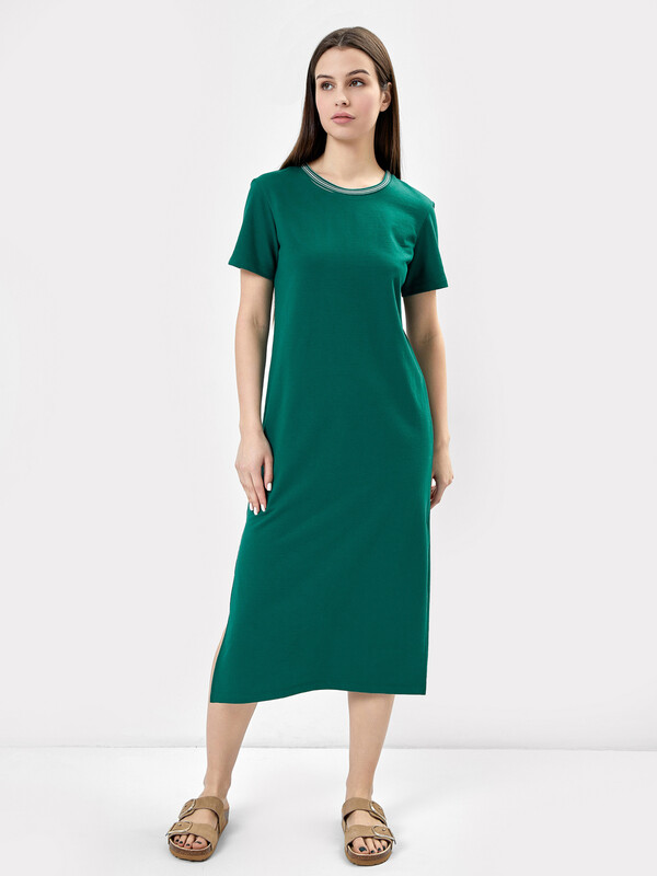 Платье свободного силуэта из футера. Платье имеет длину "миди" и удлиненную линию плеча. Изюминка модели – изящные боковые разрезы, которые очень популярны в текущем сезоне. Рукава короткие, вырез горловины круглый. Стильно!