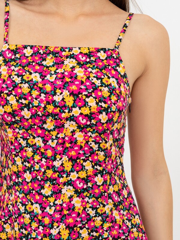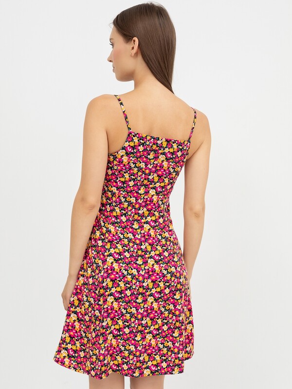 Платье изготовлено из текстильного полотна. Платье на бретельках полуприлегающего силуэта, длиной до колен. Перед и спинка с вертикальными рельефами. В левом боковом шве обработана застежка на потайную молнию. Верхний срез лифа обработан обтачкой из осн. полотна. Низ платья обработан швом вподгибку.