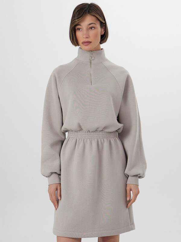 Стильное женское платье длины мини из нежного и приятного к телу трикотажного футера. Силуэт свободный, вырез круглый, с воротником-стойкой. Рукава длинные и объемные, на манжетах. По шее проходит вертикальная застежка-молния. Эластичная тесьма в поясе с декоративными строчками акцентирует внимание на талии.