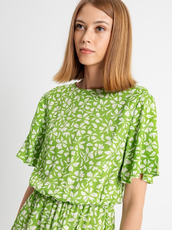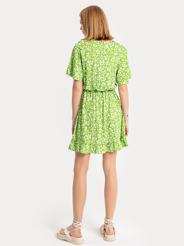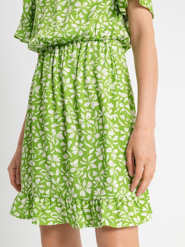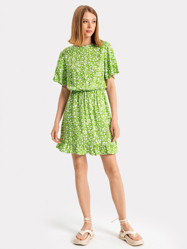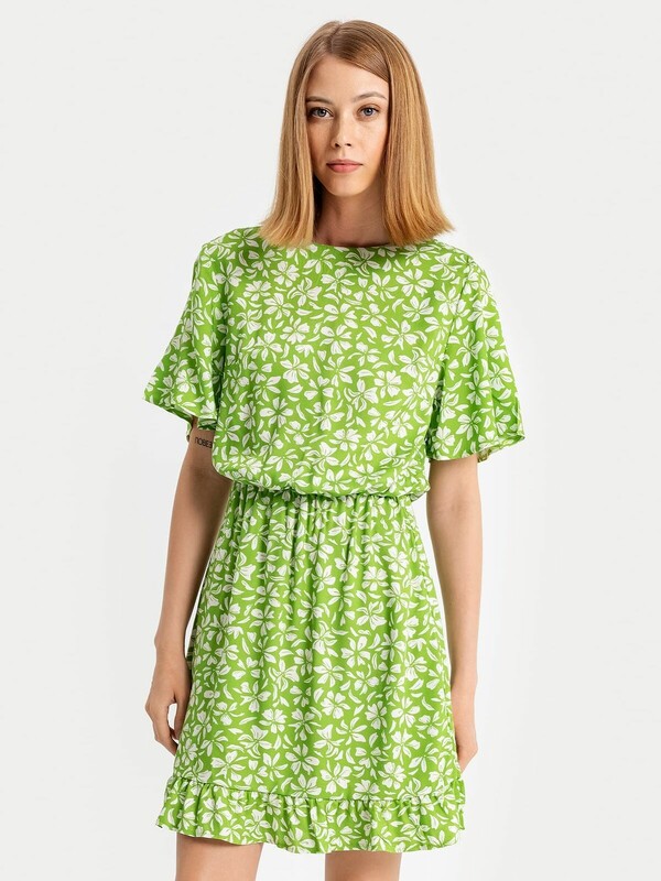 Женское полуприлегающее платье длиной выше колена из нежной и легкой вискозы. Модель отрезная по талии, внутри пояса проходит эластичная тесьма, образующая сборочки. Горловина круглая, рукава короткие и расширенные к низу. Нижний край платья украшен рюшей. На спинке застегивается на потайную молнию. Стильное платье для ваших летних образов!