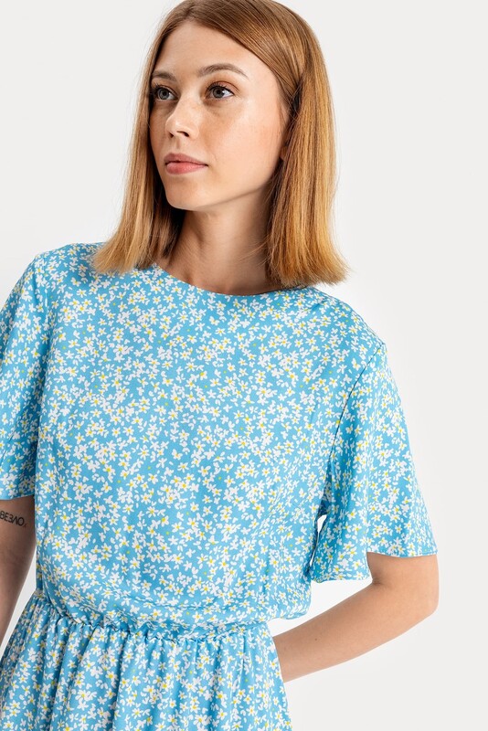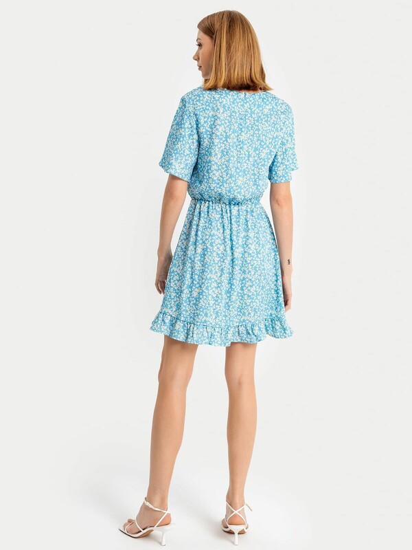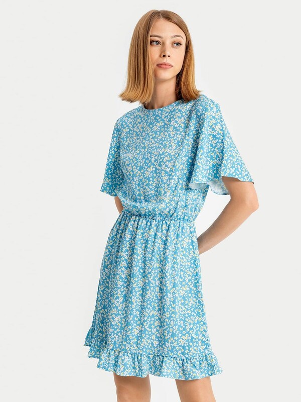 Женское полуприлегающее платье длиной выше колена из нежной и легкой вискозы. Модель отрезная по талии, внутри пояса проходит эластичная тесьма, образующая сборочки. Горловина круглая, рукава короткие и расширенные к низу. Нижний край платья украшен рюшей. На спинке застегивается на потайную молнию. Стильное платье для ваших летних образов!
