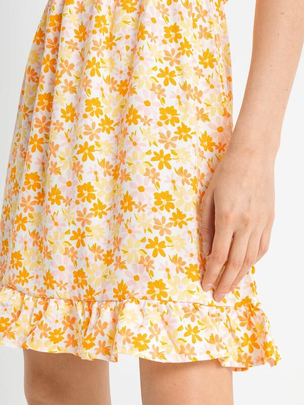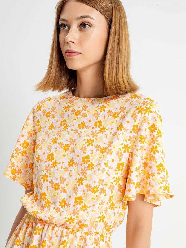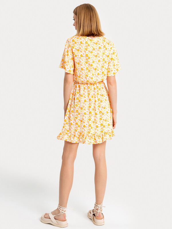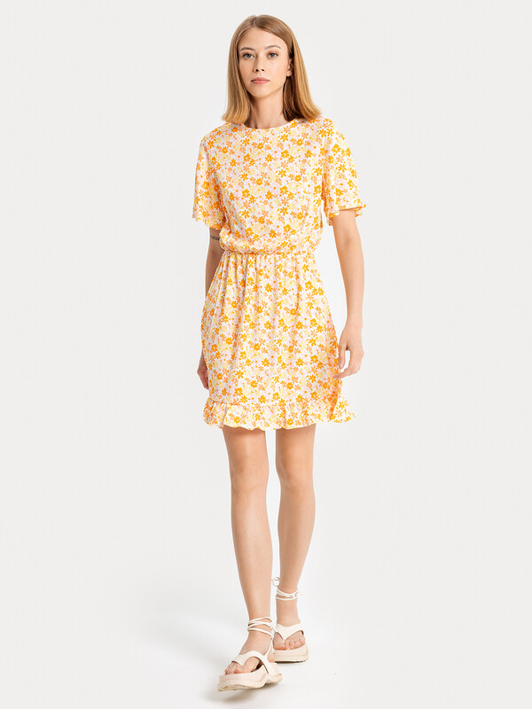 Женское полуприлегающее платье длиной выше колена из нежной и легкой вискозы. Модель отрезная по талии, внутри пояса проходит эластичная тесьма, образующая сборочки. Горловина круглая, рукава короткие и расширенные к низу. Нижний край платья украшен рюшей. На спинке застегивается на потайную молнию. Стильное платье для ваших летних образов!