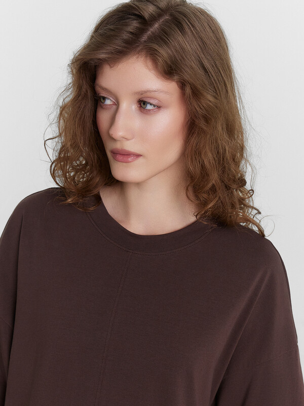Платье свободного силуэта, длиной макси. Горловина круглая, обработана обтачкой из основного полотна. Шов втачивания обтачки по спинке закрыт бейкой из основного полотна. Рукава втачные короткие, пройма углублена. Нижние срезы платья и рукавов обработаны швом вподгибку.
