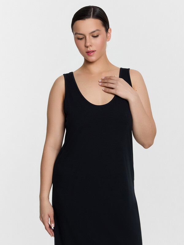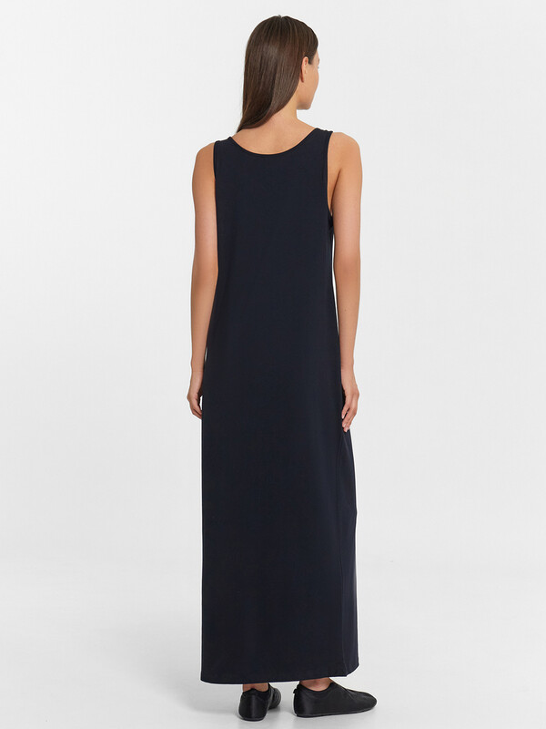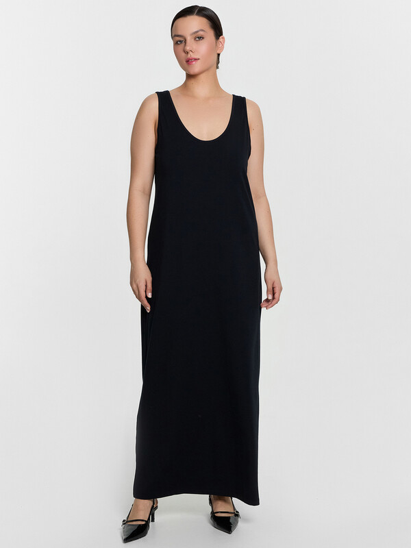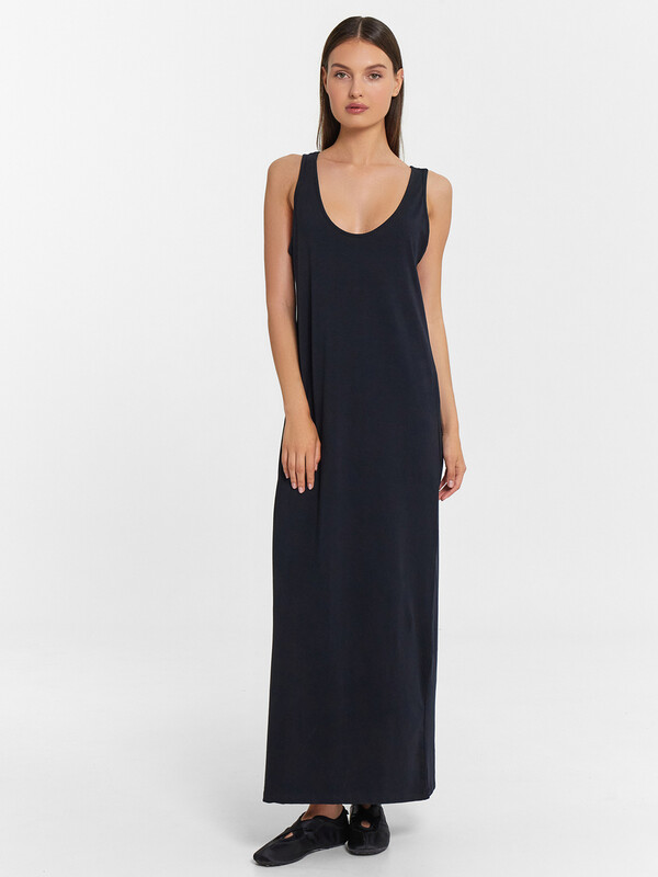 Платье на широких бретелях свободного силуэта, длиной макси. Горловина круглая, глубокая. Проймы углублены. Горловина и проймы окантованы бейками в 4 сложения из основного полотна. Нижние срезы обработаны швом вподгибку.