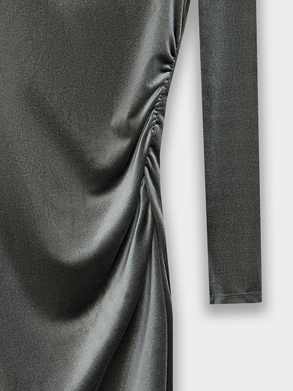 Платье выполнено из велюра с добавлением спандекса, что обеспечивает идеальное облегание и мягкость ткани. Состав из полиэстера и спандекса гарантирует сохранение формы и комфорт при движении.