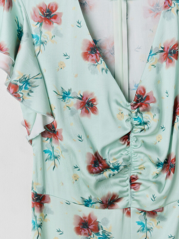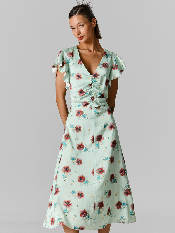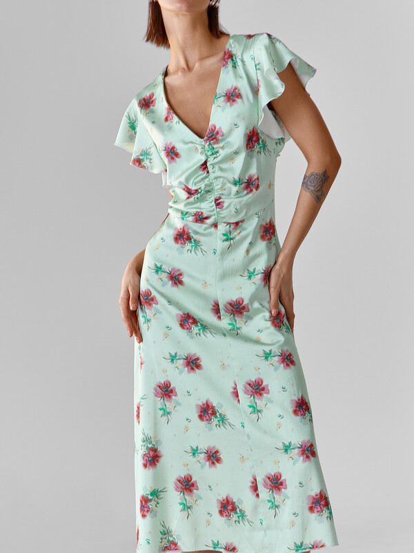 Платье полуприлегающее. Горловина с V-образным вырезом, обработана обтачкой из основного полотна. Спереди центральная сборка на жилку тканую 6мм E7112, WT4-6, низ отрезной. По спинке и переду средний шов. Сзади потайная молния. Рукава короткие, втачные. Низ изделия и рукавов обработаны на