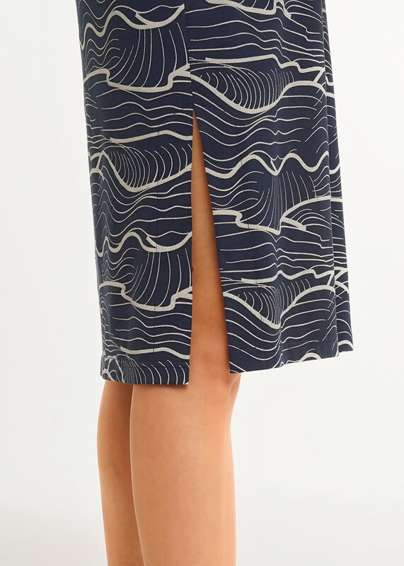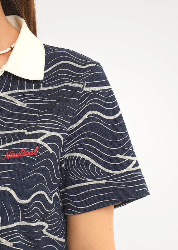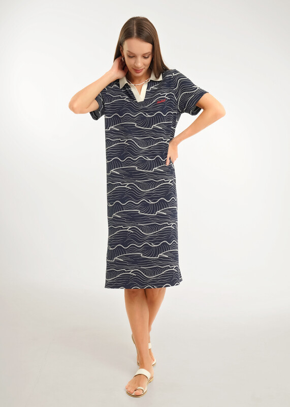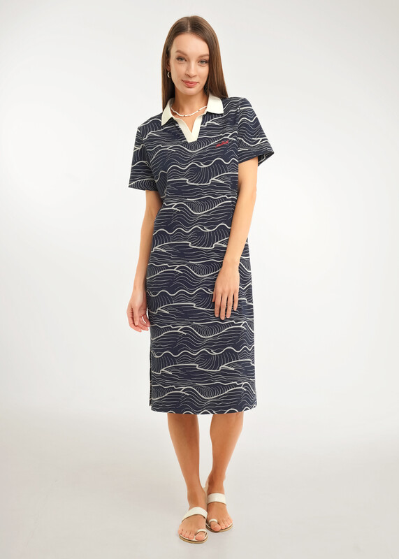 Платье-поло для дома и отдыха прямого силуэта из трикотажного полотна пике. Втачной короткий рукав. По горловине вязаный воротник с планкой. По переду принт, боковые разрезы.