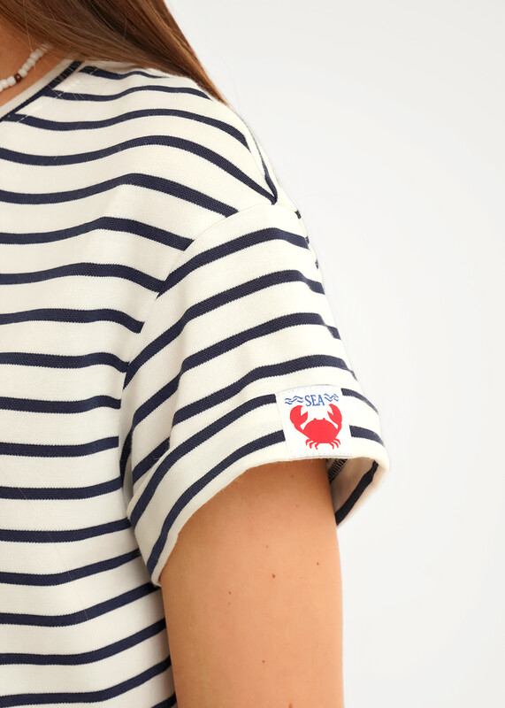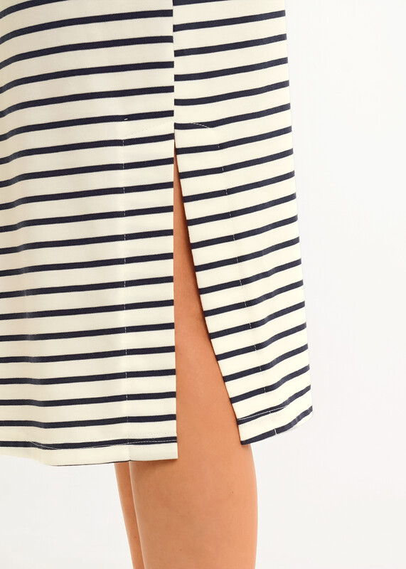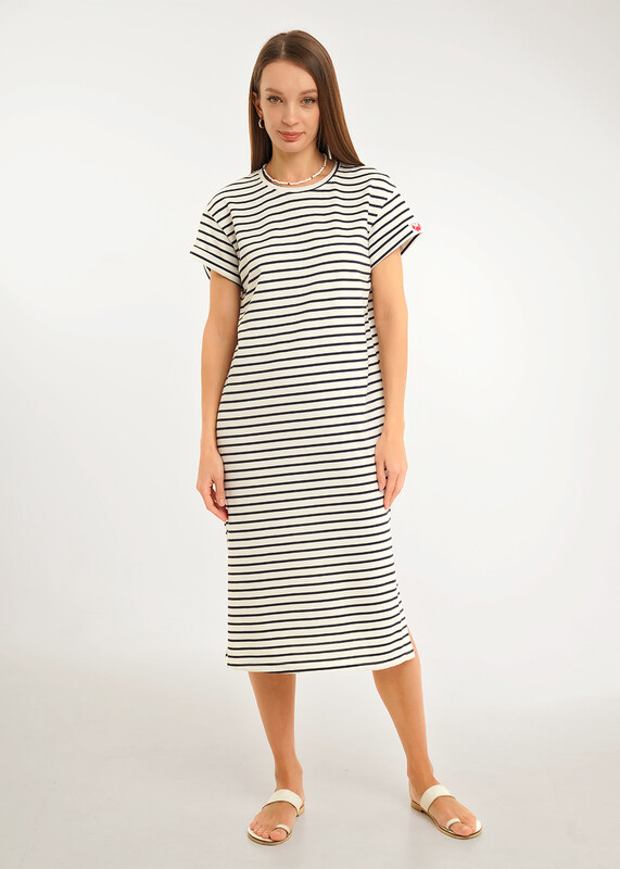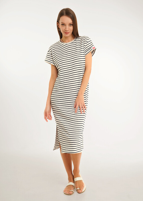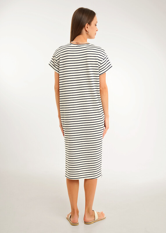 Платье для дома и отдыха прямого силуэта из трикотажного полотна пике. Втачной короткий рукав внизу с отворотом, нашивка. Округлая горловина с обтачкой. Боковые разрезы.