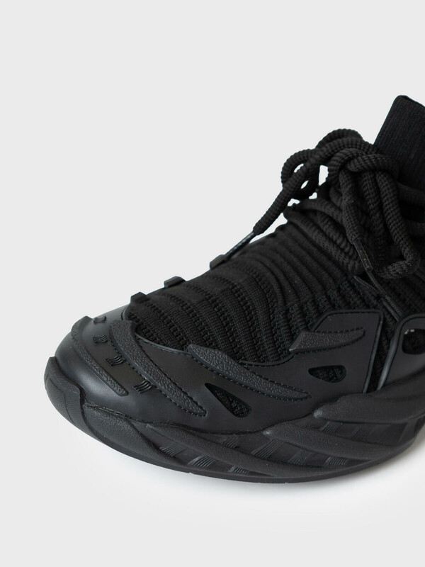Трендовые кроссовки футуристической формы мужские. Верх кроссовок выполнен по технологии socks из тянущегося дышащего трикотажа. Их можно обувать не развязывая. Нижняя часть защищена крупной ПВХ деталью. Крупные шнурки придают актуальности модели. Стелька - текстильная, съемная. Для придания прочности подошва дополнительно пристрочена к верху.