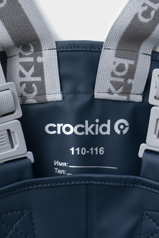 Полукомбинезон без подкладки, непромокаемый, на эластичных бретелях с регулировкой длины при помощи фастекса, сбоку под проймой кнопки для регулировки объема, низ брючин с эластичной резинкой. Для фиксации полукомбинезона используются съемные силиконовые штрипки. Светоотражающий принт в виде полосы сбоку.