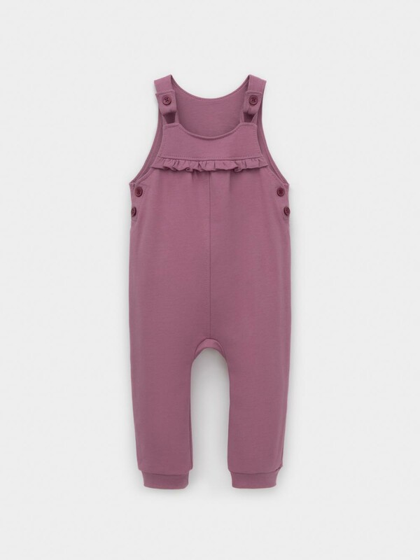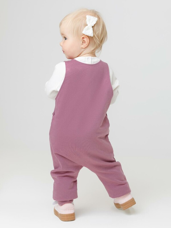 Полукомбинезон с лямками из мягкого петельчатого футера для девочки. Застёгивается на пуговицы. В размерах 74 и 80 предусмотрена пошаговая застёжка на кнопки. Низ на манжетах. Изделие сохраняет цвет и форму после многократных стирок. Все трикотажные полотна производятся в соответствии с нормами швейцарского сертификата ЭкоТекс.