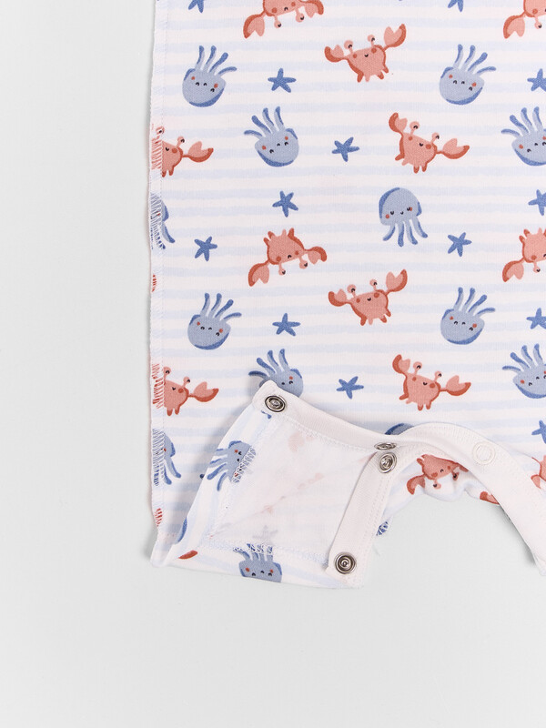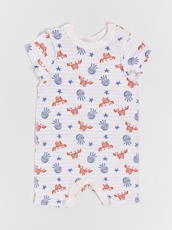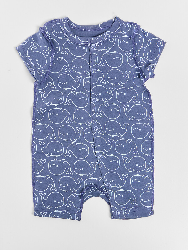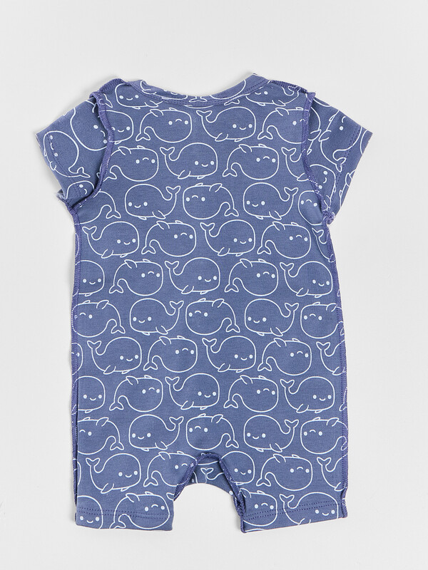 2. Длина до колен. Спинка цельнокроенная, перед с центральной застежкой на книперы 9мм. Застежка переходит в левую ножку.б Горловина круглая, окантована бейкой из полотна рибана 1*1, 97% хлопок; 3% эластан, 230 гр, 165 см (R-59, R11-049.01.230). Рукава короткие. Нижние срезы комбинезона обработан на 2х игольной плоскошовной машине швом в подгибку