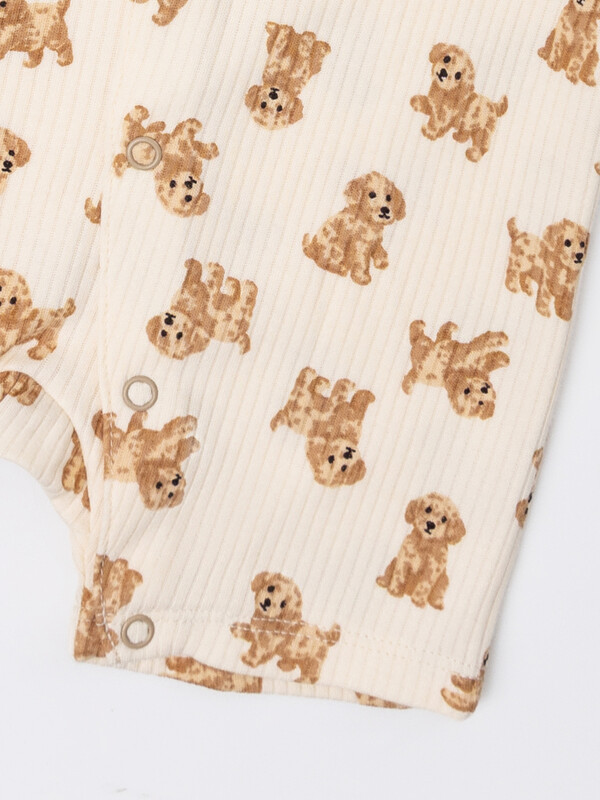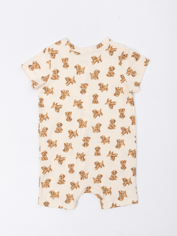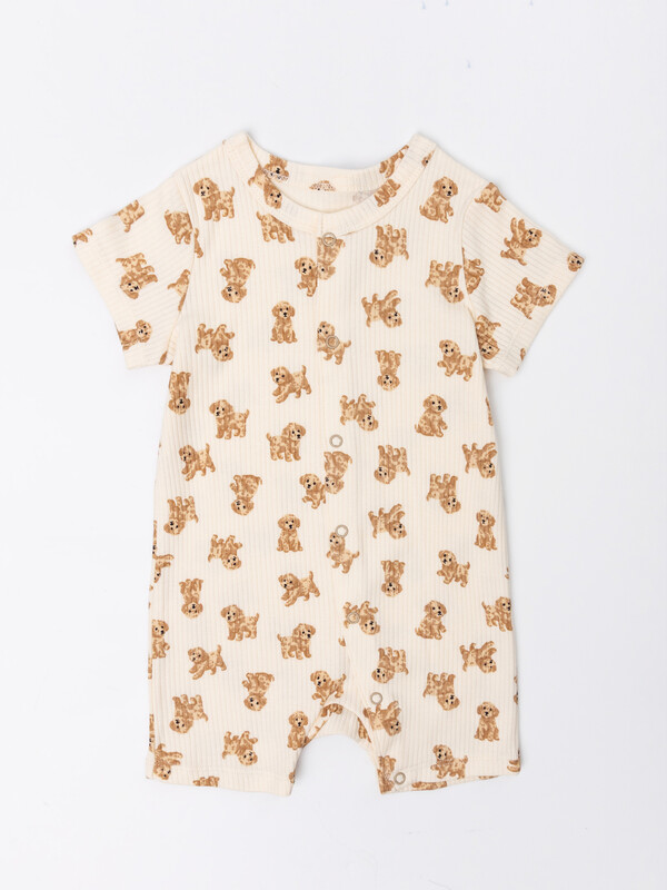 2. Длина до колен. Спинка цельнокроенная, перед с центральной застежкой на книперы 9мм. Застежка переходит в левую ножку.б Горловина круглая, окантована бейкой из полотна рибана 1*1, 97% хлопок; 3% эластан, 230 гр, 165 см (R-59, R11-049.01.230). Рукава короткие. Нижние срезы комбинезона обработан на 2х игольной плоскошовной машине швом в подгибку.