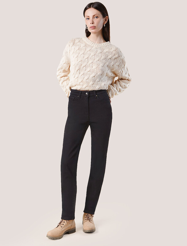 Черные прямые джинсы выполнены из эластичного денима. Внутренняя сторона изделия утепленная мягким флисом обеспечит тепло, комфорт и защиту от холода. Удлиненная модель с классической посадкой на талии визуально вытягивает силуэт. Лучший вариант для зимнего периода, когда хочется выдержать стиль и практичность.
