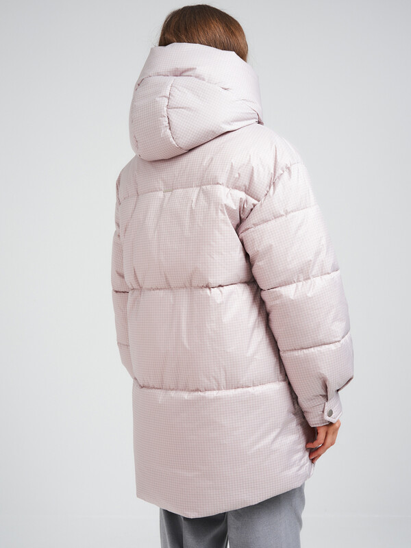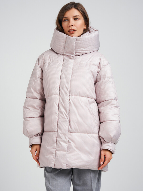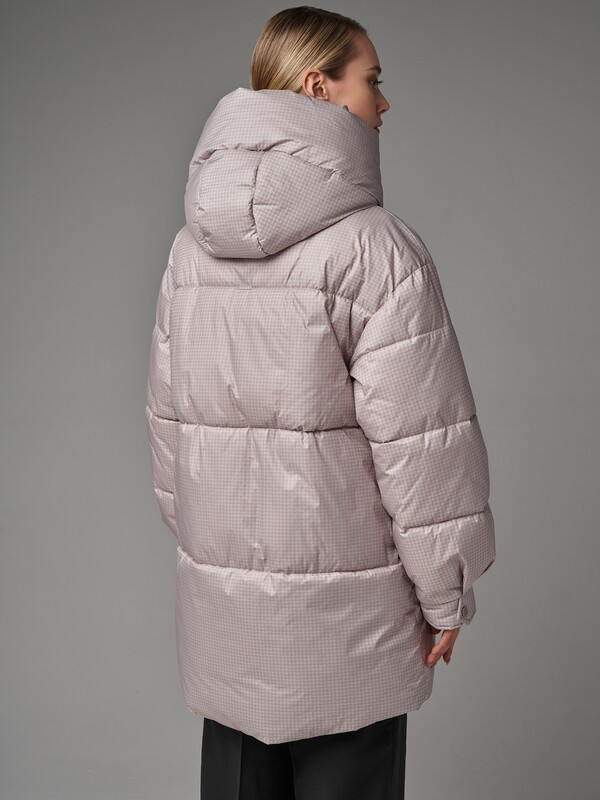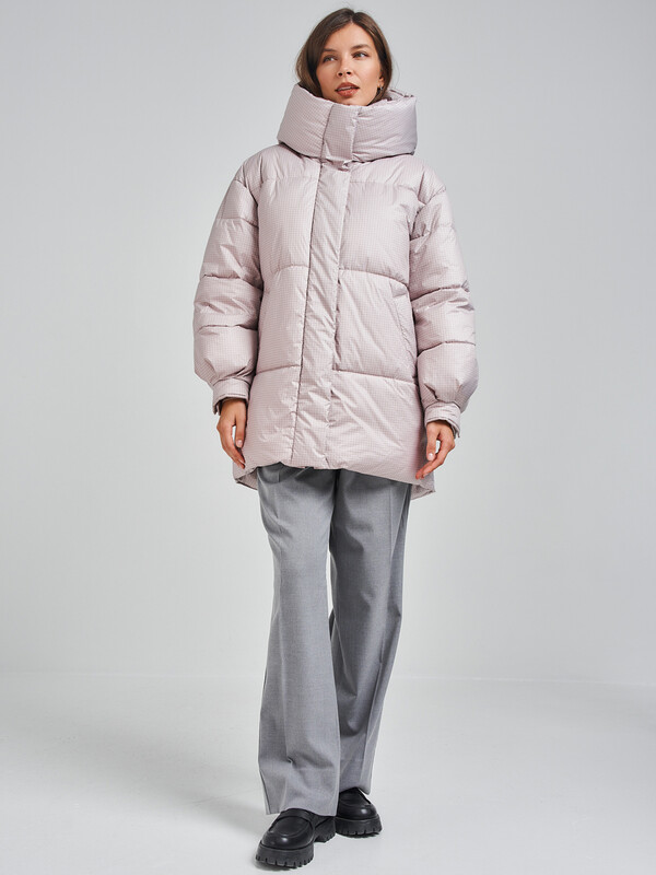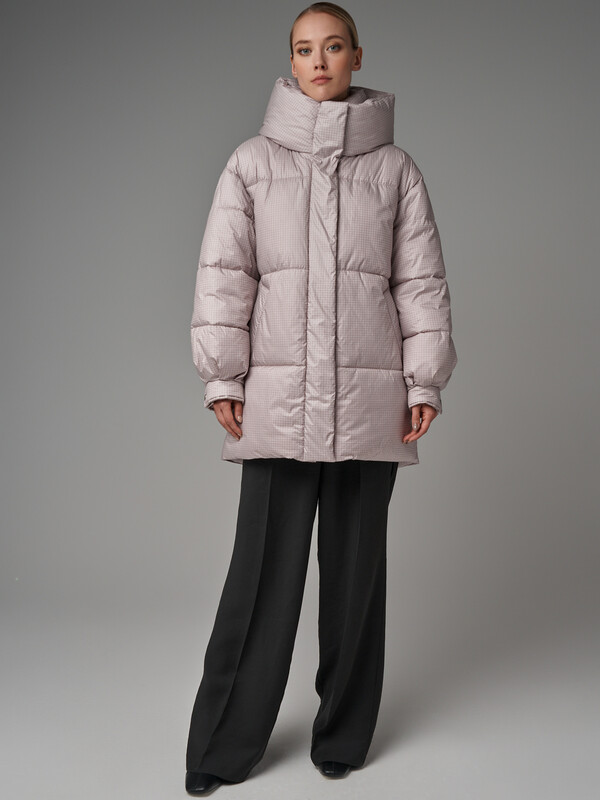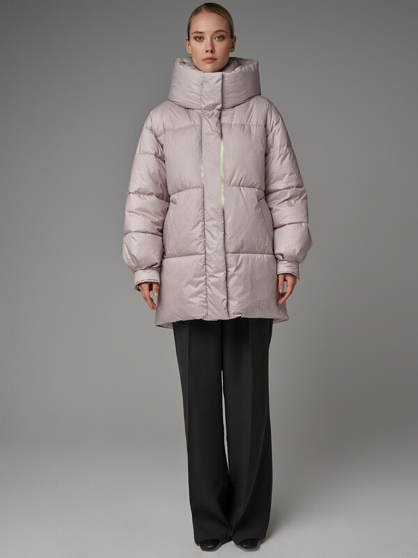 Пуховик oversize силуэта. В изделии есть внутренняя утяжка по низу. Рукав со спущенным плечом. По низу рукавов заложены складки и имеются манжеты с отделочными кнопками. Застежка на молнию, скрытую под планкой на потайных кнопках. В изделии имеются два функциональных кармана с листочками на магнитах и один внутренний карман. Ткань - плащевая с водоотталкивающей пропиткой. Утепление - Био-пух, 200 гр. Рекомендуемый температурный режим (от 0°C до -15°C). Длина изделия - 85 см. Длина рукава - 64 см.