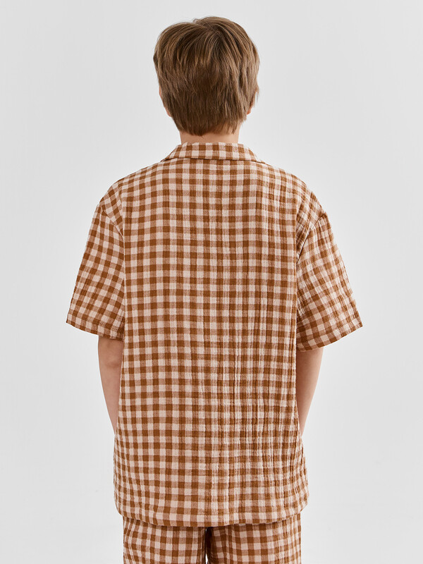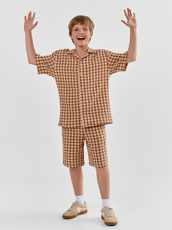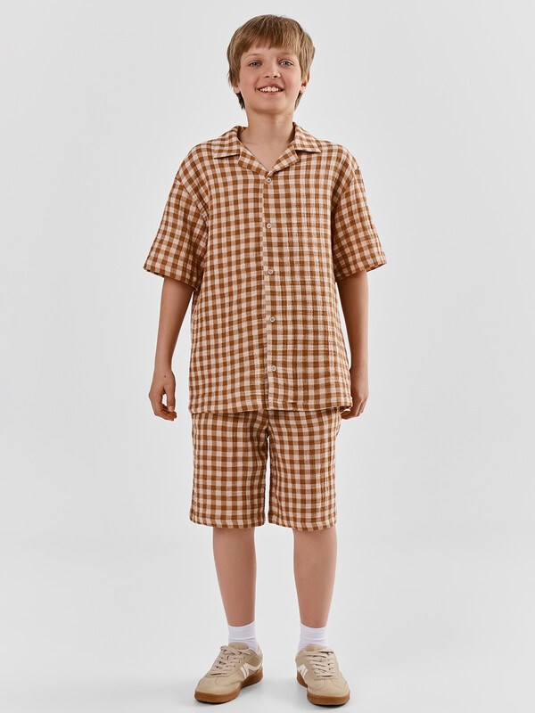 Рубашка для мальчиков прямого силуэта — это классическая и универсальная модель, подходящая как для школы, так и для повседневной носки. Отложной воротник придает образу аккуратность и завершенность, а застежка на пуговицах по всей длине делает рубашку удобной и практичной. Короткие рукава со слегка спущенной линией плеча создают расслабленный силуэт, обеспечивая свободу движений. Нижние срезы изделия и рукавов аккуратно обработаны швом вподгибку, что подчеркивает качество исполнения и повышает износостойкость модели. Изделие выполнено из смеси льна и хлопка — натуральных материалов, которые обеспечивают отличную воздухопроницаемость, комфорт и приятные тактильные ощущения. Такая ткань особенно хорошо подходит для теплого времени года и чувствительной детской кожи.