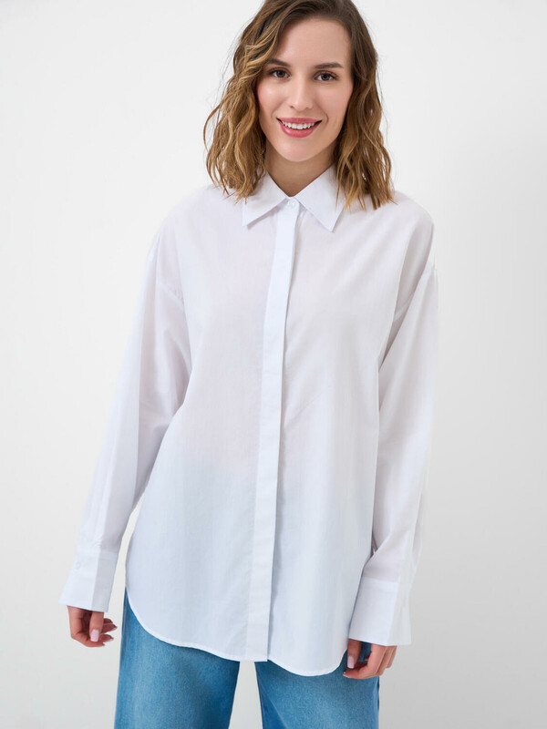 Женская белая рубашка. Модель свободного кроя выполнена из лёгкого материала. Удобная застёжка на пуговицы. Классический отложной воротник, длинные рукава с манжетами на пуговицах. Нижний край рубашки красиво округлён.