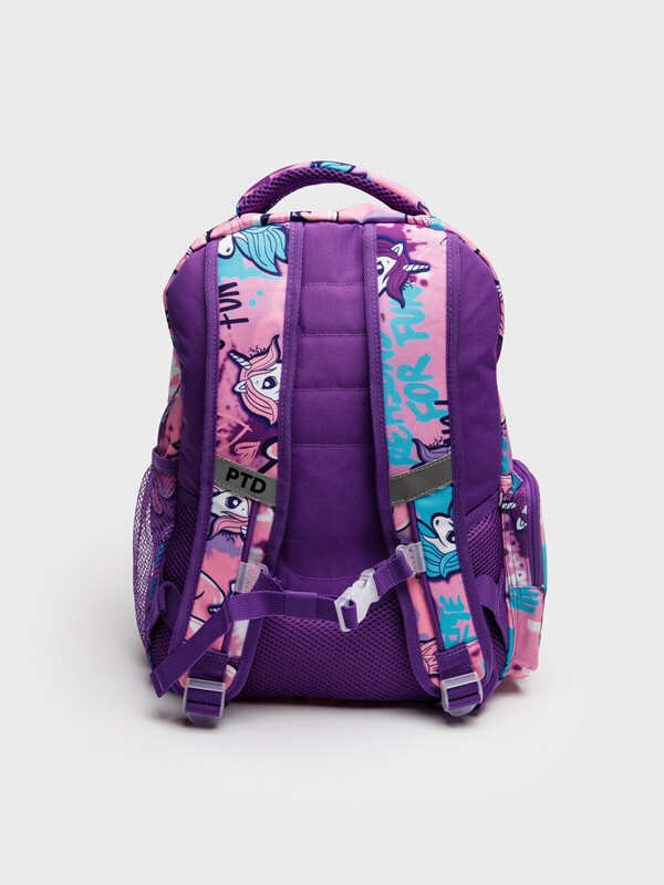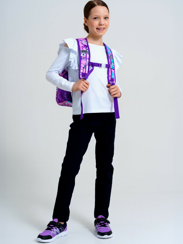 Школьный рюкзак для девочки подростка. Прямые широкие регулируемые лямки с мягкими вкладками и сетчатым покрытием для улучшения вентиляции, 3 основных отделения на молнии, 2 боковых кармана: сетчатый и на молнии. Внутри: 1 отсек: карман на молнии, открытые карманы для канцелярии. 2 отсек: без карманов, 3 отсек: карман для папок, карман на молнии, 2 кармана без замка, карабин для крепления пропуска/пенала/ключей, усиленная спинка, дно и верхняя ручка, спинка и обратная часть плечевых ремней - сетчатые, для улучшенной вентиляции, светоотражающие элементы на переднем кармане и плечевых ремнях. Рюкзак в школу можно дополнить мешком для обуви и пеналом в том же дизайне.