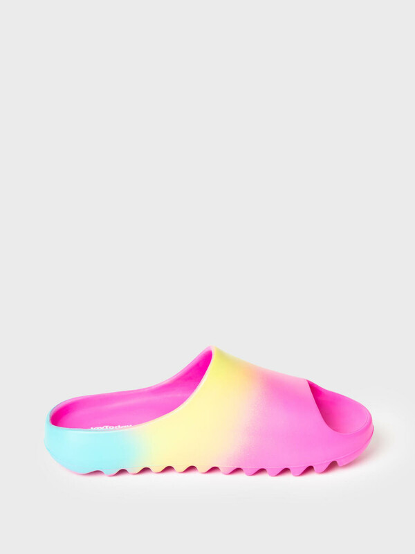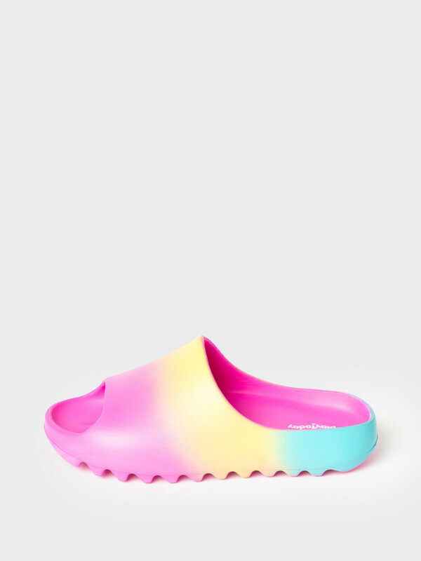Модные шлепанцы для девочки подростка. Модель для пляжа и бассейна из облегченного и прочного ЭВА. Модель имеет градиентное радужное окрашивание. Материал хорошо моется. Форма модели учитывает эргономику стопы.