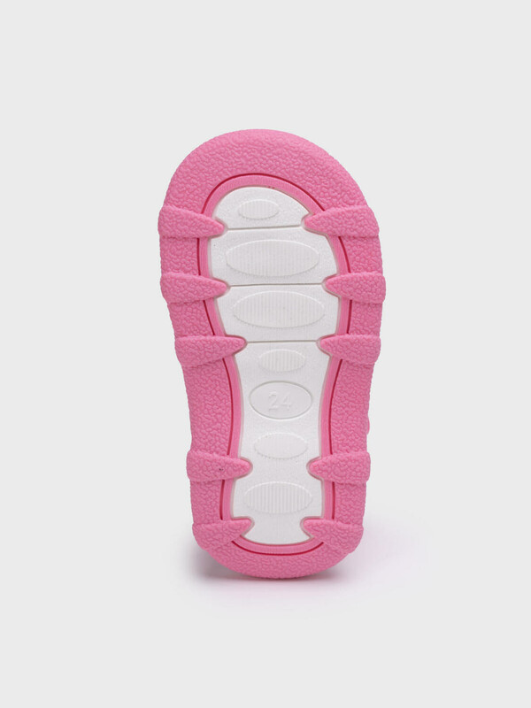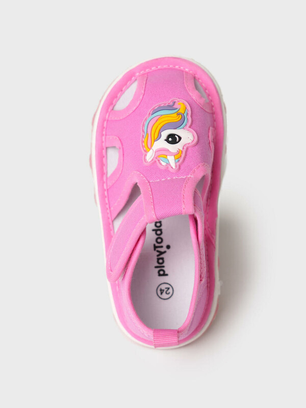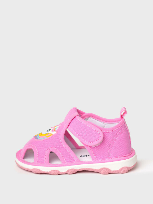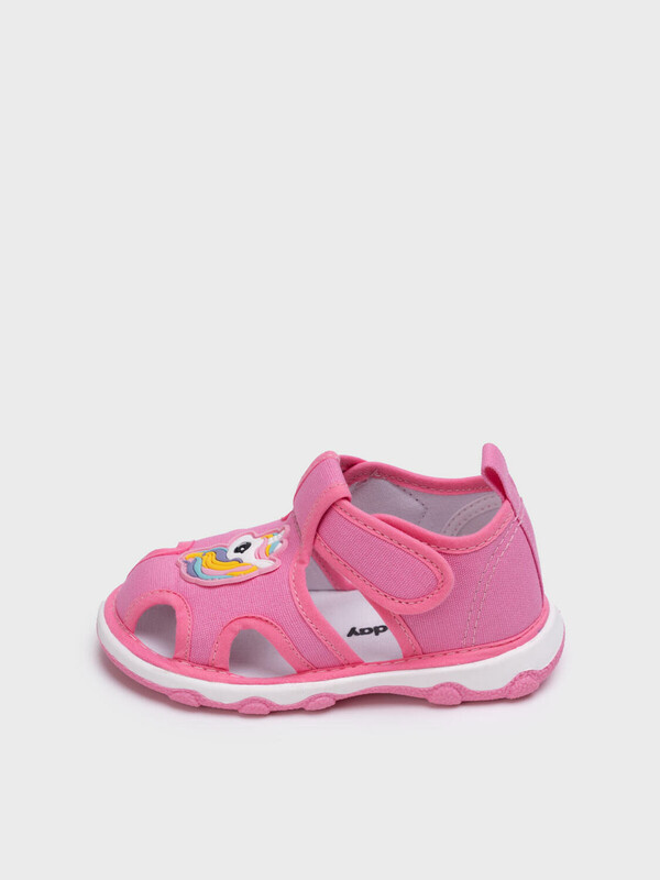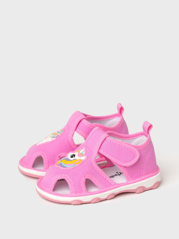 Сандалии детские для девочки. При ходьбе сандалии издают писк - для ребенка это интересный игровой элемент, а мамы будут всегда слышать своего ребенка на детской площадке. При желании пищалку можно вынуть. Сандалии с закрытой пяткой и удобным ремнем с липучкой, который позволяет ребенку обуваться самостоятельно. Модель выполнена из экологичного и гипоаллергенного хлопкового материала, который идеально подходит для маленьких детей. Разные патчи (мороженое и единорог) на правой и левой полупаре позволяют ребенку в игровой форме научиться определять правую и левую ножку. Двухсоставная подошва из ТПР очень гибкая, легкая и нескользкая. Особая технология сборки обуви добавляет ей дополнительный комфорт.