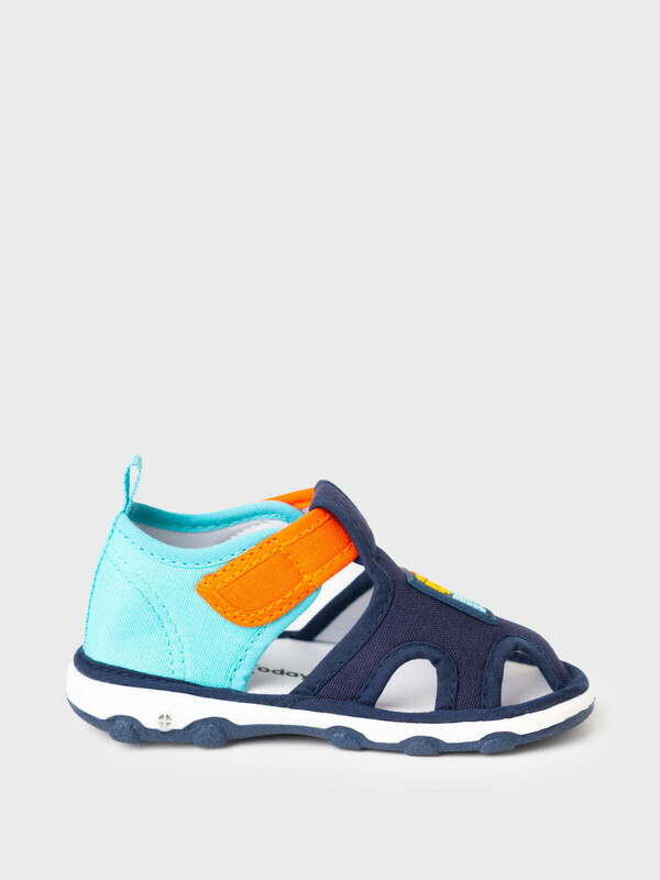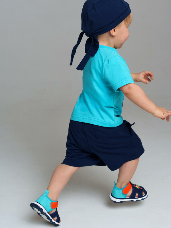 Сандалии детские для мальчика. При ходьбе сандалии издают писк - для ребенка это интересный игровой элемент, а мамы будут всегда слышать своего ребенка на детской площадке. При желании пищалку можно вынуть. Сандалии с закрытой пяткой и удобным ремнем с липучкой, который позволяет ребенку обуваться самостоятельно. Модель выполнена из экологичного и гипоаллергенного хлопкового материала, который идеально подходит для маленьких детей. Разные патчи на правой и левой полупаре позволяют ребенку в игровой форме научиться определять правую и левую ножку. Двухсоставная подошва из ТПР очень гибкая, легкая и нескользкая. Особая технология сборки обуви добавляет ей дополнительный комфорт.
