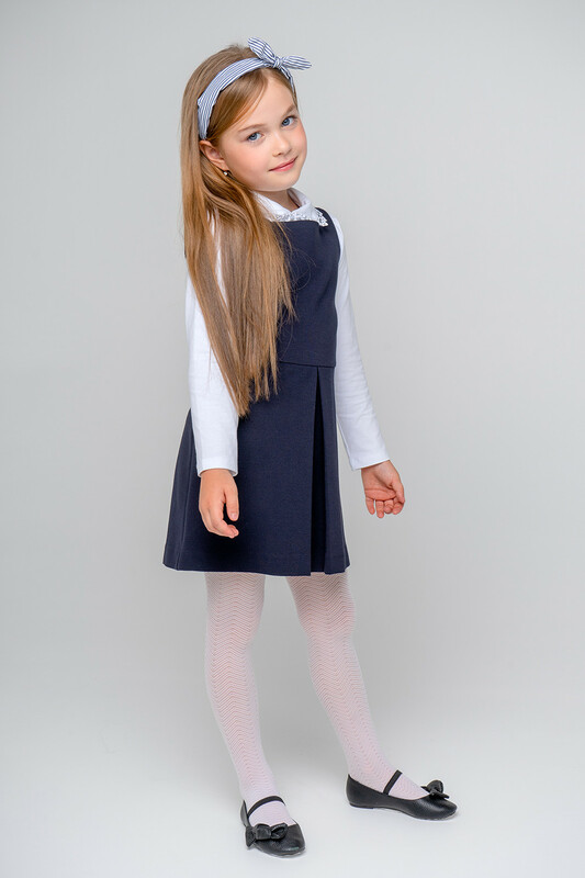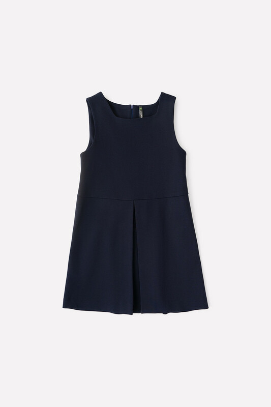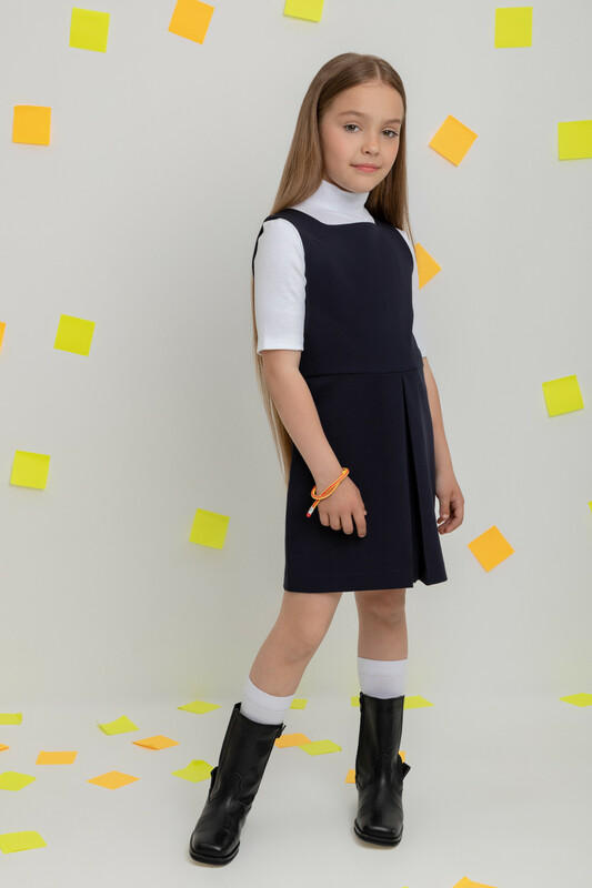 Отрезной сарафан для школы. Сшит из трикотажа тёмно-синего цвета. Застёгивается на спинке на потайную молнию. Украшен широкой складкой впереди по центру.