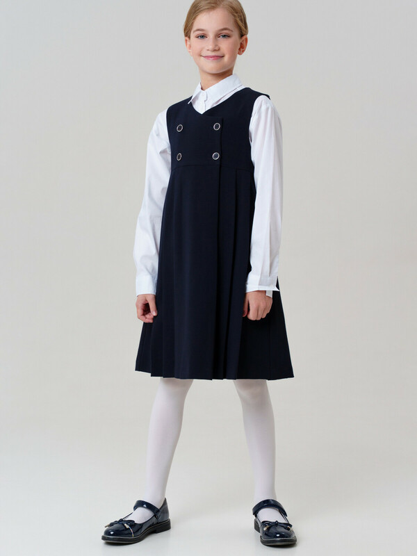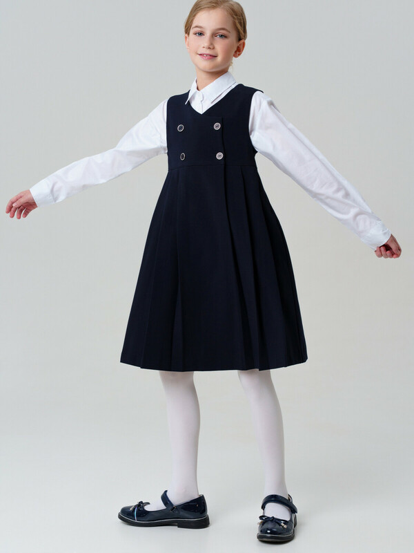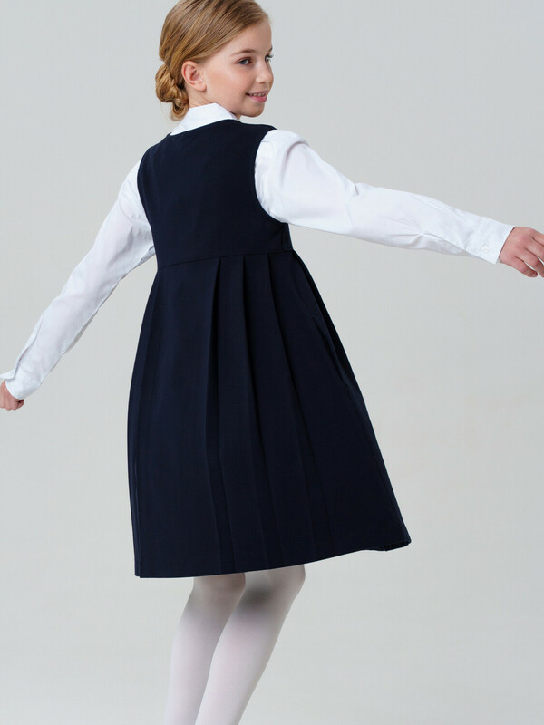 Темно-синее школьное текстильное платье сарафан для девочки-подростка
