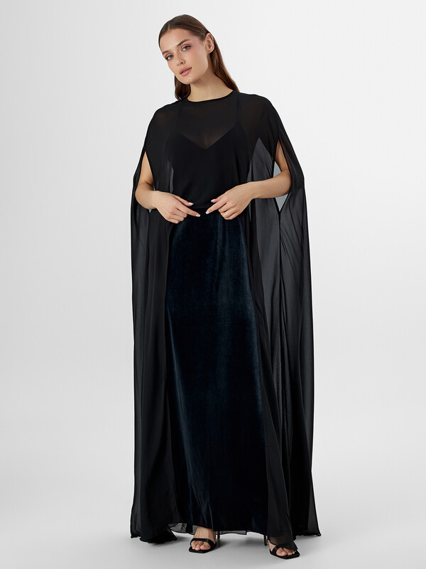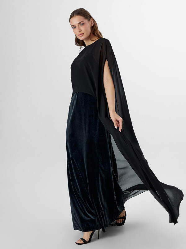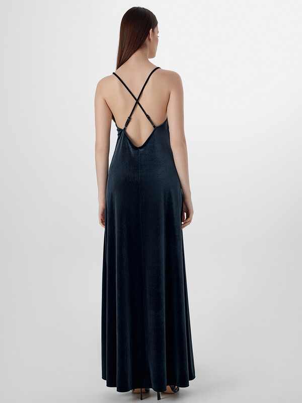 Сарафан изготовлен из трикотажного полотна велюр. Сарафан полуприлегающего силуэта, длиной макси на подкладке из кулирки. Сарафан на бретелях с регулировкой по длине на кольца (металл М008 8мм) и регуляторы (металл М808В 8мм). Горловина V-образной формы. По спинке глубокий вырез. Спинка со средним швом. Подкладка укороченная. Нижний срез обработан швом вподгибку.