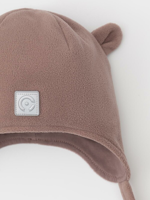 Флисовая шапка на завязках с мягким подкладом из натурального хлопка. Сверху украшена декоративными ушками из флиса. Спереди прикреплён светоотражатель, который обеспечивает дополнительную безопасность в тёмное время суток. Шапка сохраняет цвет и форму после многократных стирок.