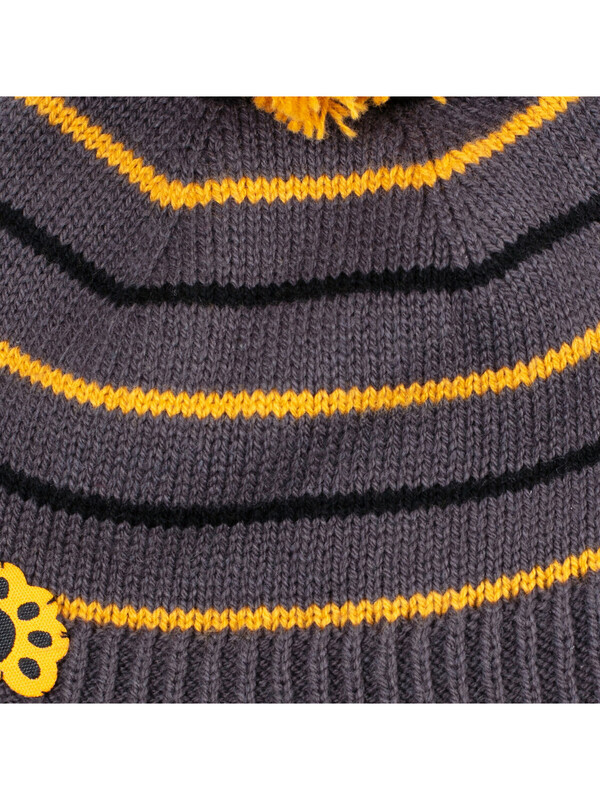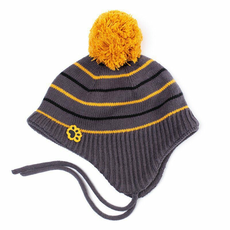 Трикотажная шапка для мальчиков с завязками и ярким помпоном. Модель декорирована принтом в полоску.