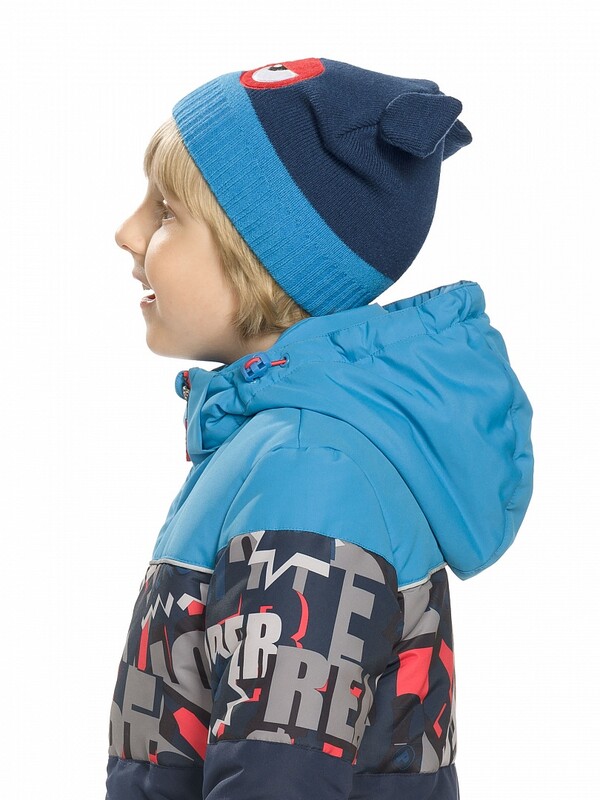 Шапка для мальчиков. Двойная вязка, без отворота. Оригинальная шапка с ушами и аппликацией в форме маски.