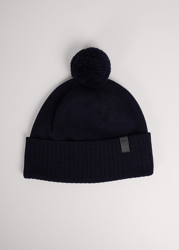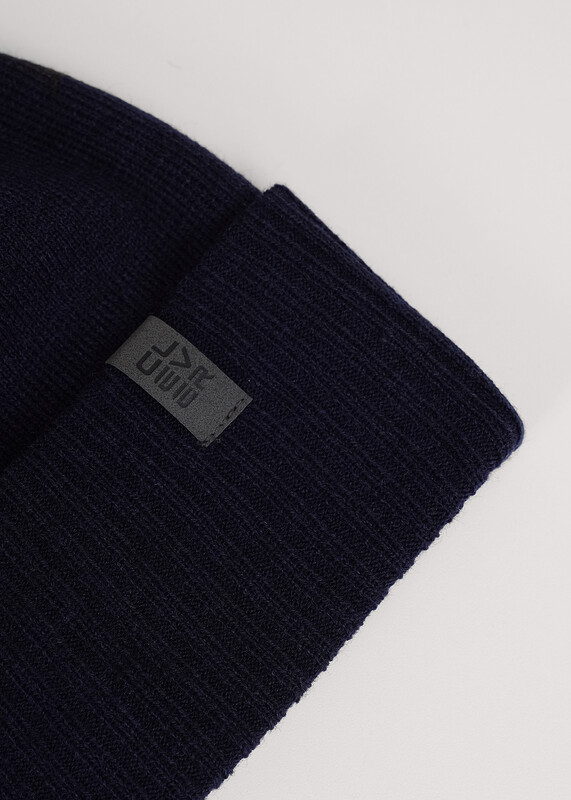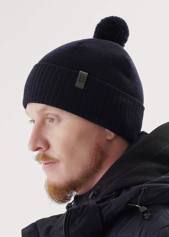 Мужская шапка двойная с отворотом и ниточным пампоном, без подклада. Выполнена из высококачественной пряжи с добавлением шерсти, декорирована стильной нашивкой. Станет не только отличной защитой от холода, но и модным аксессуаром.