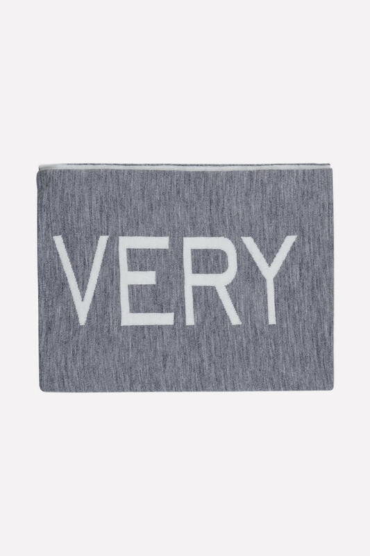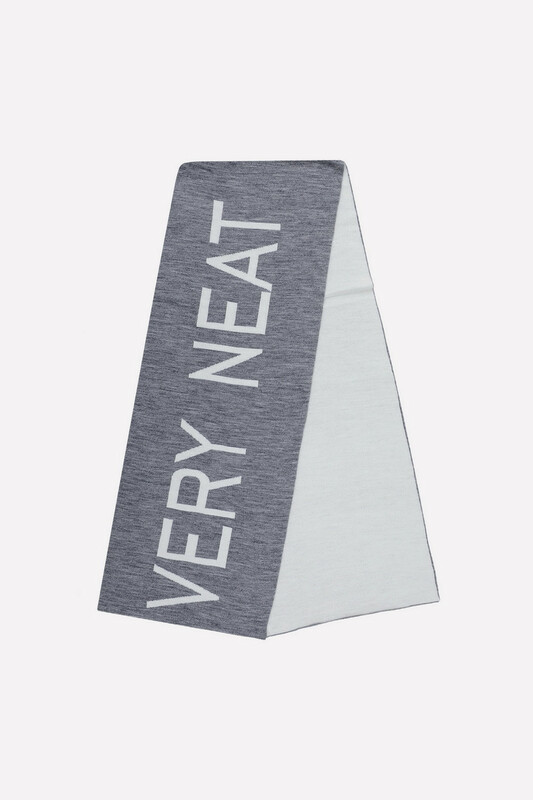 Двусторонний шарф из полушерсти с вывязанным рисунком в виде надписи VERY NEAT. Длина - 200 см, ширина - 40 см. Связан гладью. Украшен фирменной этикеткой.