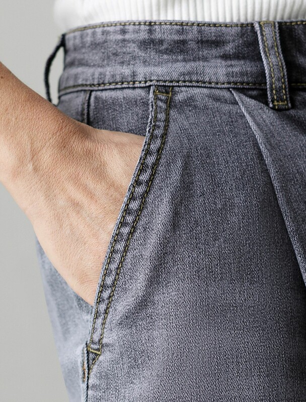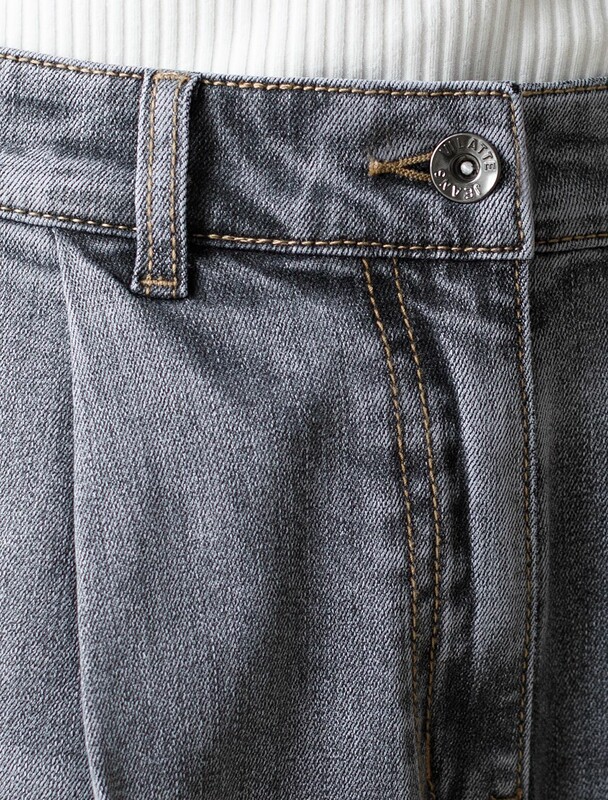Свободные широкие джинсы серого цвета с защипами из эластичного денима созданы для тех, кто ценит комфорт и стиль в повседневной жизни. Модель отличается свободным кроем, который обеспечивает удобство движений и гармонично подчеркивает современный силуэт. Защипы добавляют изюминку и делают образ более интересным, а также визуально вытягивают силуэт. Благодаря использованию эластана материал сохраняет свою форму даже после длительной носки и многочисленных стирок.