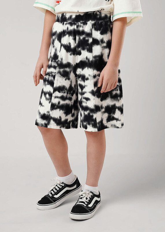 Стильные набивные шорты для мальчика из мягкого трикотажного полотна. Пояс на резинке с регулировкой обеспечивает комфортную посадку. Декоративные резы по переду с необработанными краями создают модный акцент.