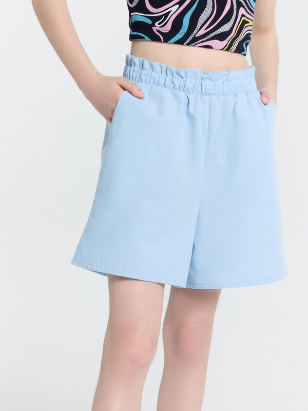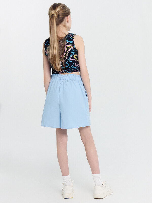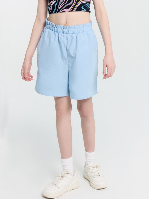 Шорты изготовлены из текстиля. Шорты свободные. Пояс отрезной, внутрь застрочена эластичная тесьма. В боковых швах передних частей шорт наклонные карманы. Низ изделия обработан на 2-х игольной плоскошовной машине швом в подгибку.