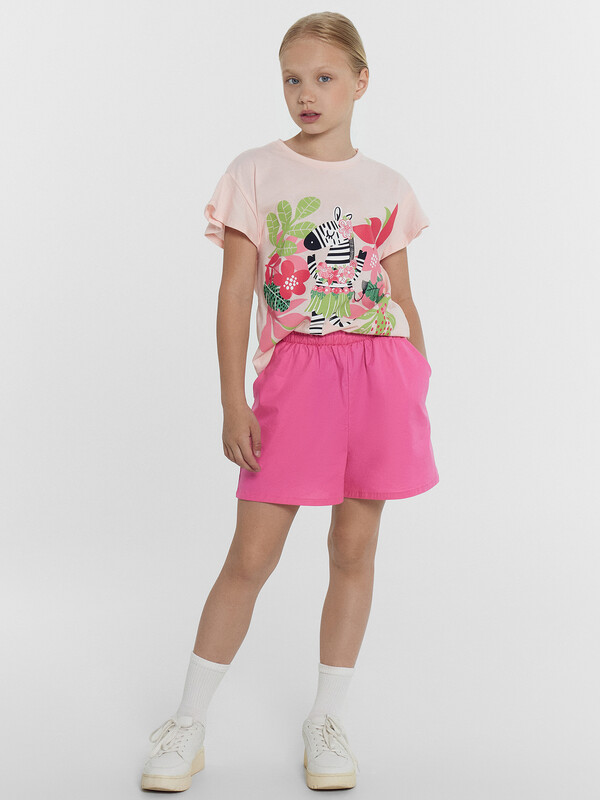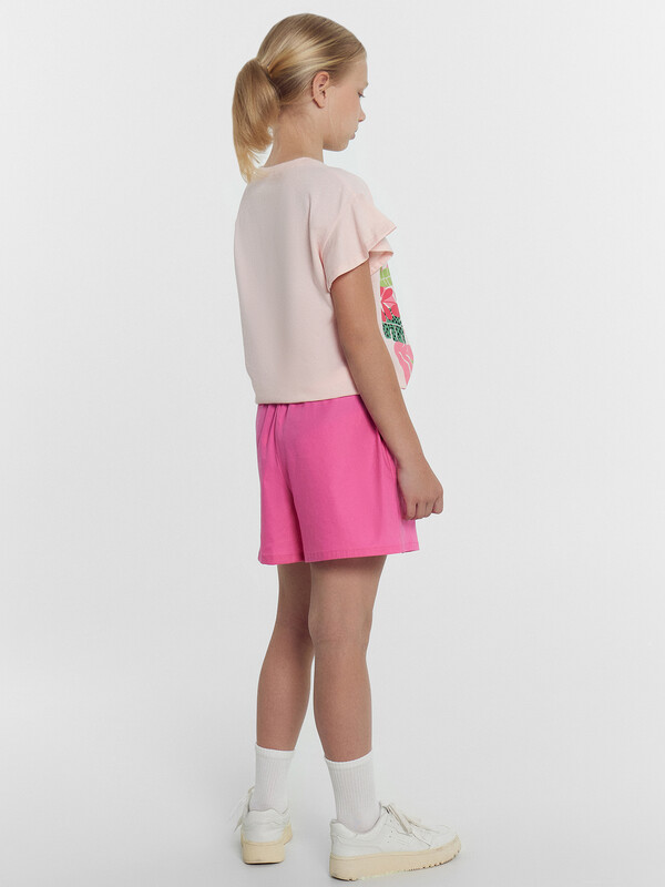 Шорты изготовлены из текстиля. Шорты свободные. Пояс отрезной, внутрь застрочена эластичная тесьма. В боковых швах передних частей шорт наклонные карманы. Низ изделия обработан на 2-х игольной плоскошовной машине швом в подгибку.