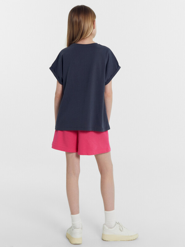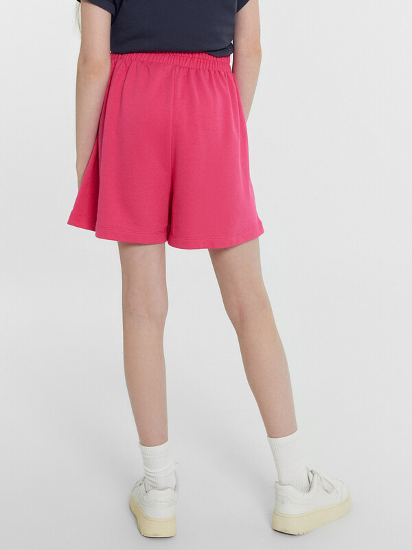 Шорты свободного силуэта из трикотажного футера. Широкий пояс с эластичной тесьмой внутри дарит комфорт. Рекомендуем для вашей девочки!