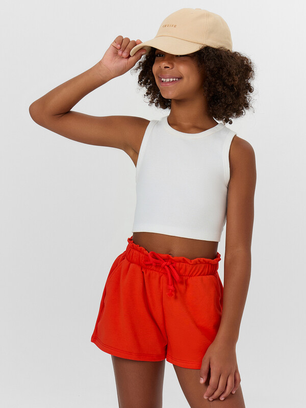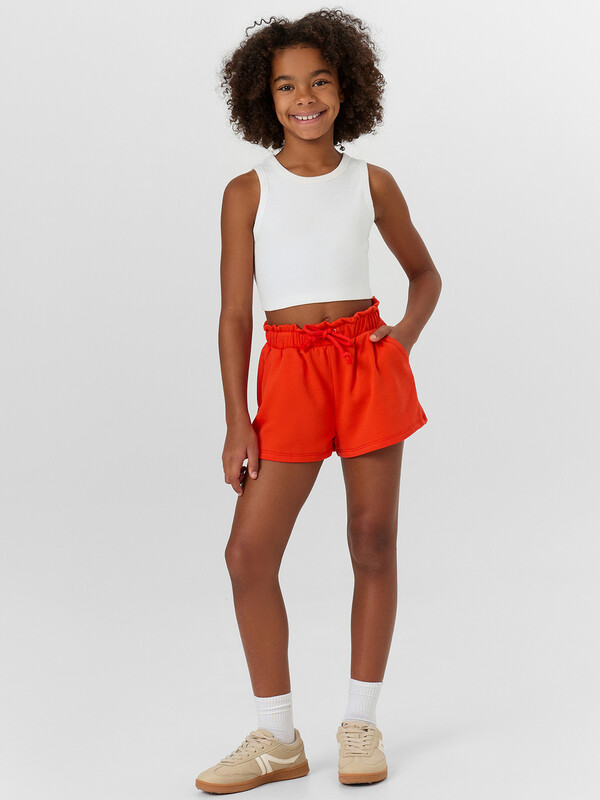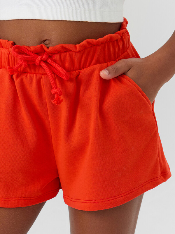 Короткие шорты для девочек прямого силуэта. Посадка средняя. Пояс отрезной с эластичной тесьмой и декоративным шнуром. По поясу выполнена декоративная строчка. На передних половинах обработаны карманы с наклонным входом от боковых швов. Низ шорт обработан швом в подгибку.