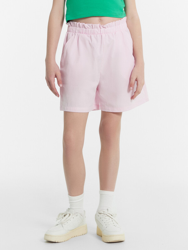 Шорты для девочек короткие. Пояс отрезной, с втаченной эластичной тесьмой RV30, образующей сборку. На задних деталях шорт клапаны имитирующие карман, с закрепкой посередине. Низ шорт обработан швом в подгибку.