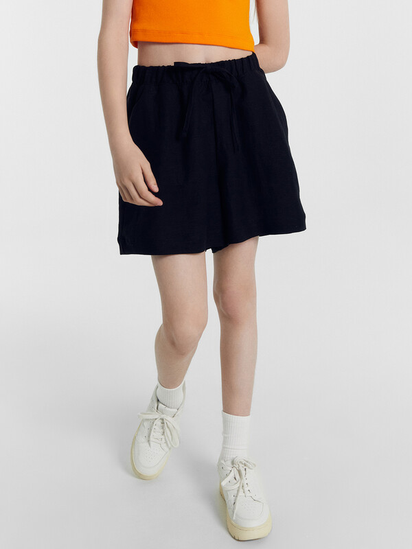 Шорты для девочек свободного силуэта из ткани. Посадка высокая. На детали переда карманы с отрезным бочком. Пояс отрезной с эластичной тесьмой RV40 внутри, на поясе пробиты петли и вставлен шнур из основного полотна. Шов втачивания пояса распошит. Длина выше колена. Низ обработан швом вподгибку с закрытым краем.