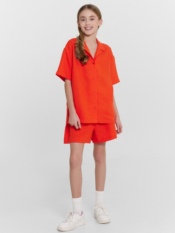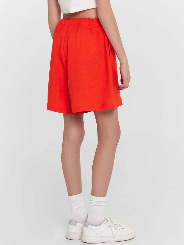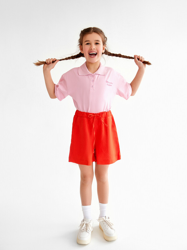 Шорты для девочек свободного силуэта из ткани. Посадка высокая. На детали переда карманы с отрезным бочком. Пояс отрезной с эластичной тесьмой RV40 внутри, на поясе пробиты петли и вставлен шнур из основного полотна. Шов втачивания пояса распошит. Длина выше колена. Низ обработан швом вподгибку с закрытым краем.