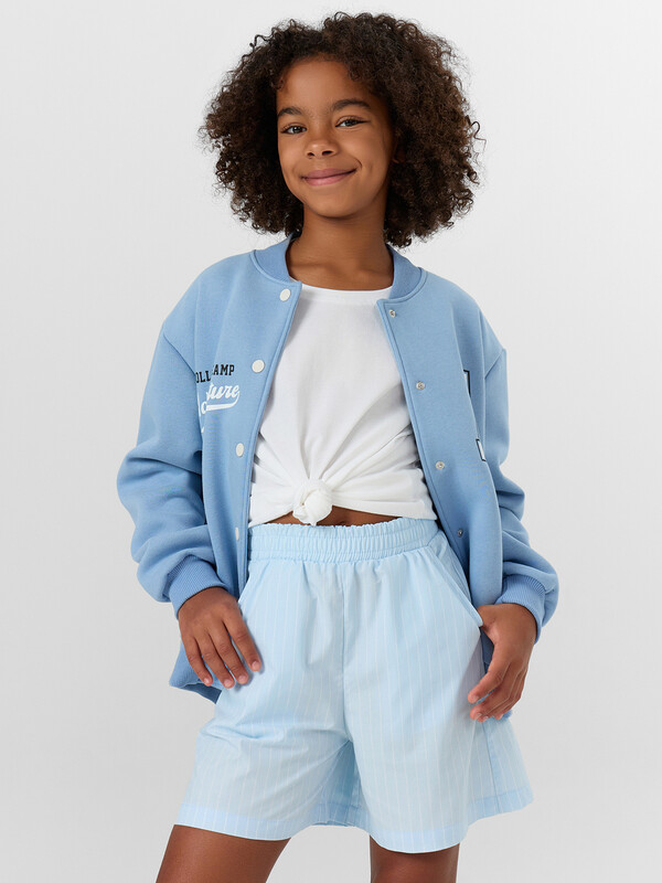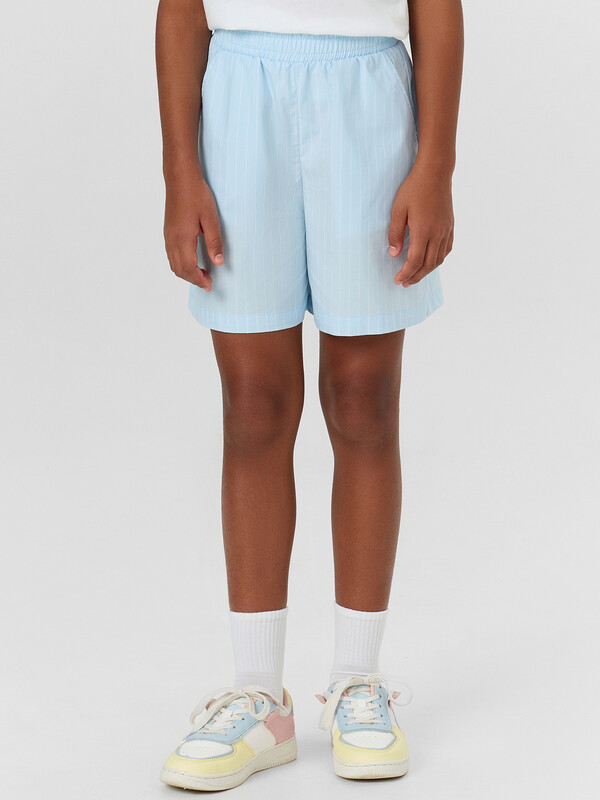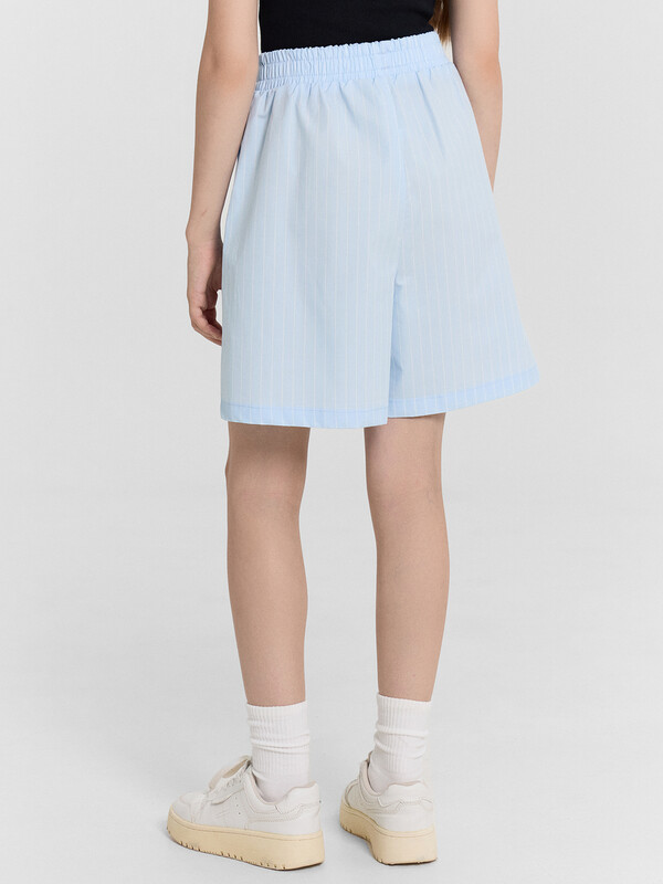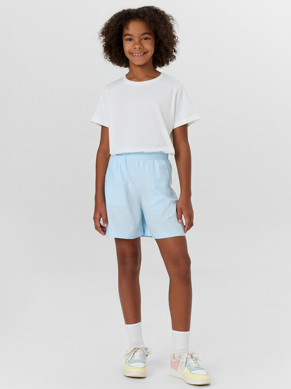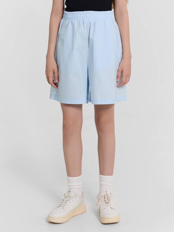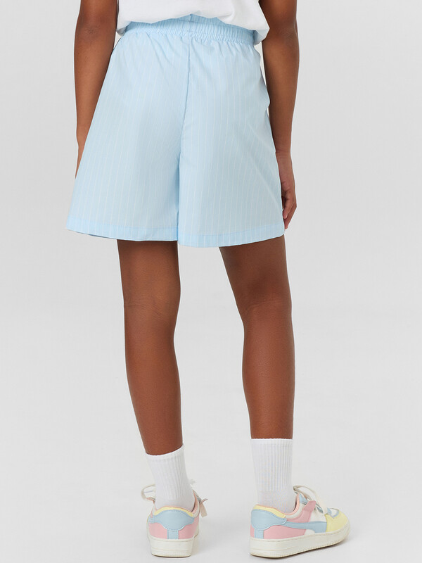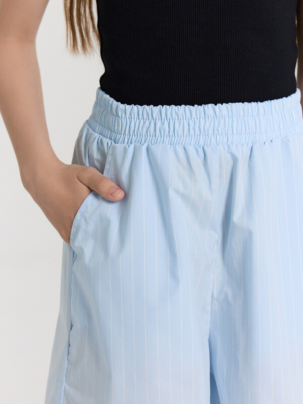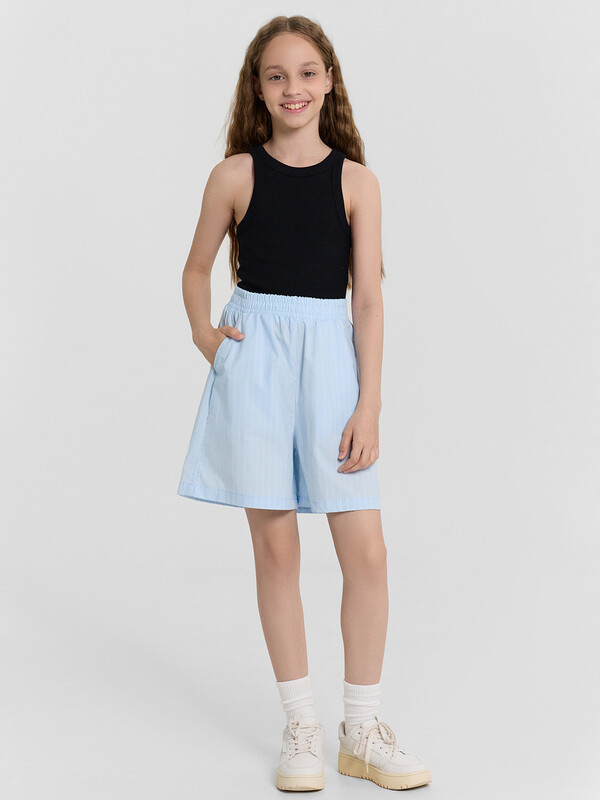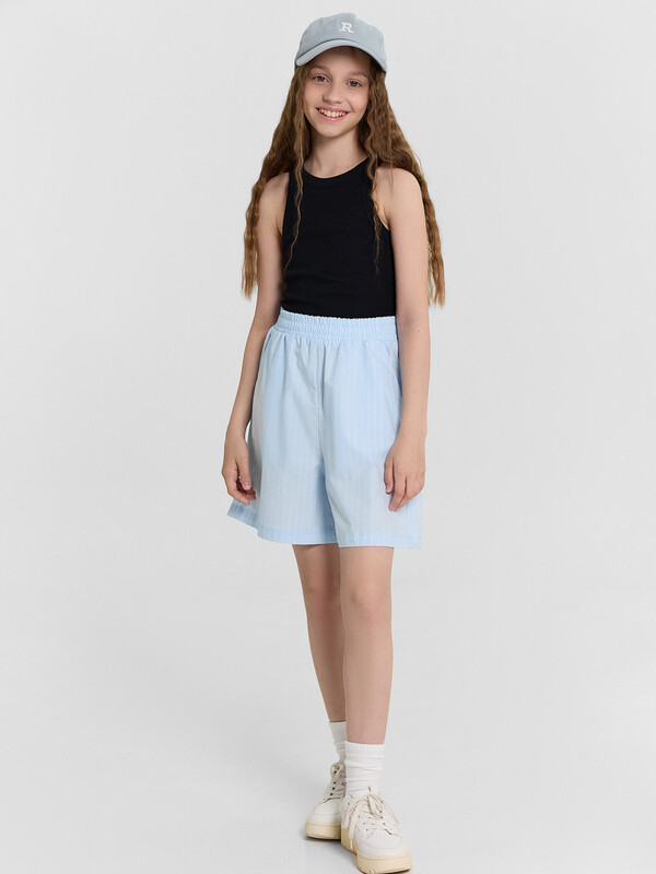 Шорты с посадкой на талии прямого силуэта. Пояс отрезной с резиной внутри 50RV, отстрочен. По переду обработаны карманы «хулиганы». Низ изделия застрочен швом в подгибку.